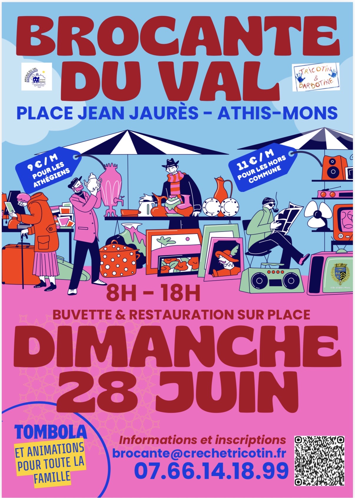 Les tarifs « athégiens » seront appliqués uniquement sur présentation d’un justificatif (envoi après réservation à l’adresse mail : brocante@crechetricotin.fr)